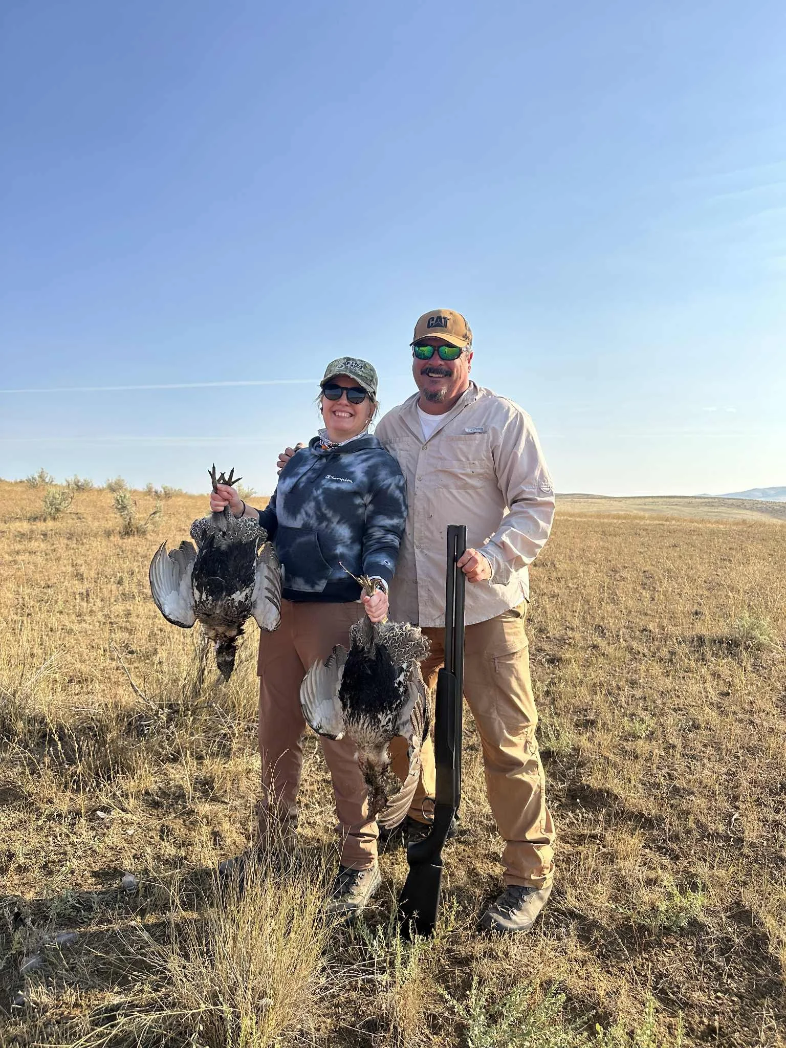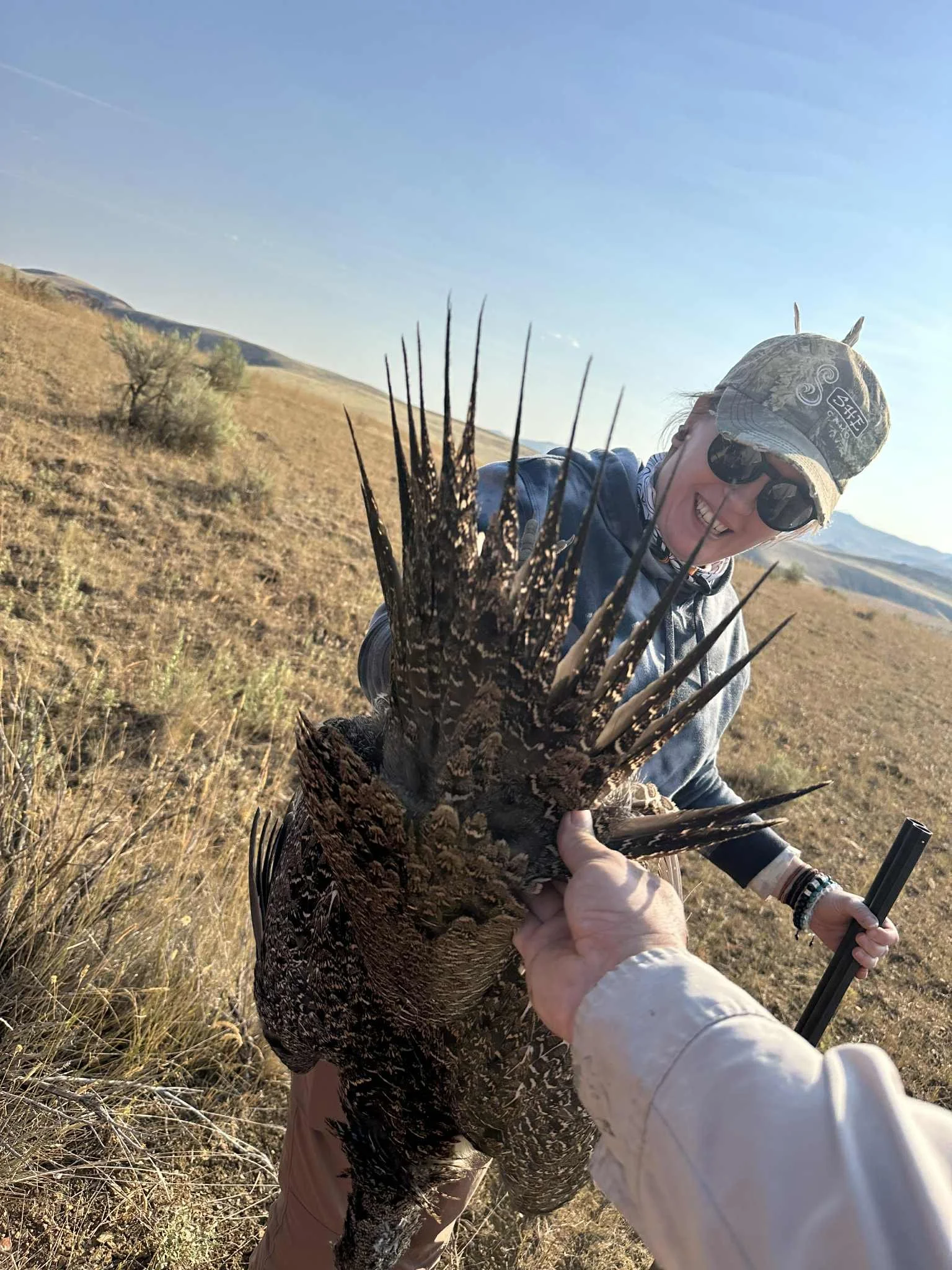 This was all a good thing, as I was just excited to be out on the land in the morning. I didn’t want the hunt to end right away. We loaded back up and set out glassing the hills with binocs to see movement in the sagebrush. The landscape wasn’t offering much in sage-grouse, but we did see plenty of meadowlarks, a few mule deer bucks, a herd of mule deer does, a coyote, and a young badger. Tim recommended we go back towards where the truck was parked and hike to a certain area. As we were traveling down the main road, I was keeping a keen eye on the hills close by to see if I could spot anything. All of a sudden, I noticed a silhouette that wasn’t normal along the hillside, a dark break against the yellow cheatgrass and medusa head. As my head flipped around, I didn’t even need to say anything; Tim knew I must have seen something. He slowed the side-by-side and looked to the left over his shoulder and saw what I had. A massive male, along with a smaller male, is what we spotted initially. With a loaded shotgun (and prepared for the size this time), I aimed and took down the first one, then aimed towards the second, larger male, as more sage-grouse flew from the sagebrush. Finally, just as the day had started to feel hopeless, I was able to fill my tag! We settled down and recounted how many we saw that flew away as well, so we could document them on the paperwork. What an experience! All three of us were excited after the whole ordeal. We took a moment to examine the birds and get loaded up so we could take them home and clip their wings to submit to ODFW.
